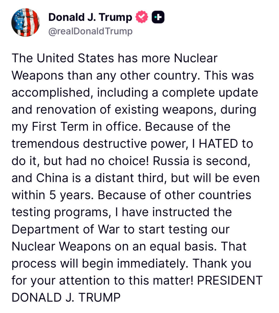 עוד כתב: "בגלל כוח ההרס העצום, שנאתי לעשות זאת, אבל לא הייתה לי ברירה! רוסיה במקום השני, וסין במקום השלישי, אבל זה יקרה גם תוך 5 שנים. בגלל תוכניות ניסוי של מדינות אחרות, הוריתי למשרד המלחמה להתחיל בניסויי כלי הנשק הגרעיניים שלנו באופן שווה. תהליך זה יתחיל באופן מיידי. תודה על תשומת הלב לעניין זה! הנשיא דונלד ג'יי טראמפ".