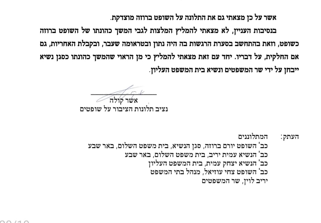 בעקבות תלונת ח”כ קרויזר: “התלונה נגד השופט ברוזה נמצאה מוצדקת, תיבחן המשך כהונותו כסגן הנשיא”