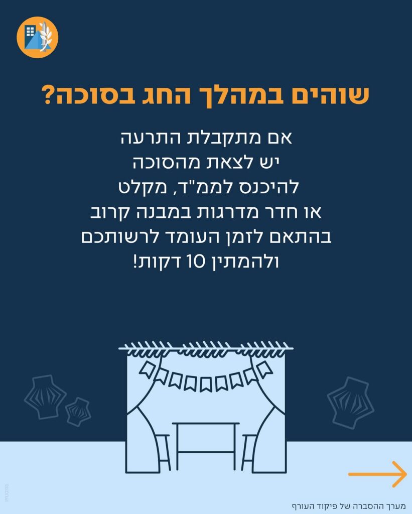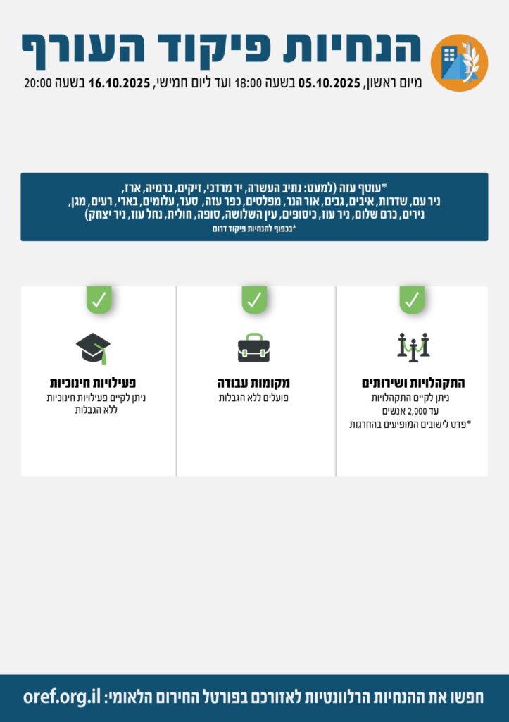בצל הדיווחים השונים על קידום תוכנית שחרור חטופים של הנשיא טראמפ, פיקוד העורף עדכן הערב (א') את הנחיותיו לימים הקרובים, בין מהיום – 5 באוקטובר ועד ליום חמישי – 16 באוקטובר. מדיניות ההתגוננות החדשה – ללא שינוי.