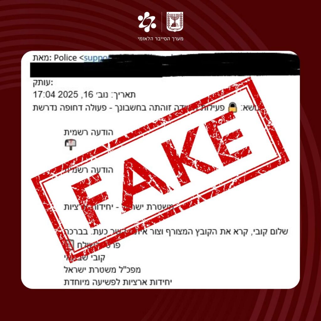 במערך הסייבר הלאומי התקבלו דיווחים על מיילים שמתחזים למשטרת ישראל, עם כותרות כמו “פעילות חשודה זוהתה בחשבונך” וקובץ מצורף “רשמי”. זה פייק!
