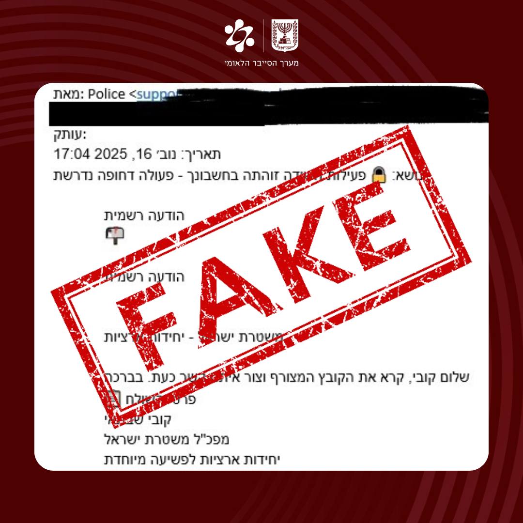במערך הסייבר הלאומי התקבלו דיווחים על מיילים שמתחזים למשטרת ישראל, עם כותרות כמו “פעילות חשודה זוהתה בחשבונך” וקובץ מצורף “רשמי”. זה פייק!