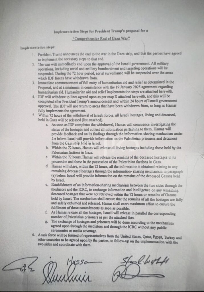 לכאן חדשות הגיעו פרטים בלעדיים על מסמך הסכמות דרמטי שנוסח בין ישראל לחמאס, המתווה מתווה לסיום המלחמה ברצועה תחת הכותרת המהדהדת: "סיום כולל למלחמת עזה". המסמך, עליו חתומות המתווכות הבינלאומיות ארה"ב, קטאר, מצרים וטורקיה, חושף את הפרטים הקפדניים של יישום ההסכם, החל ממסירת מידע על חללים ועד לפיקוח בינלאומי.
