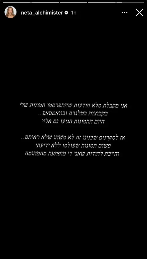 בימים האחרונים מופצות ברשת תמונות של נטע אלחמיסטר, בהלבשה תחתונה מתוך יום צילום פרטי שנערך בדירה בתל אביב – וכל זה מבלי שידעה שהיא מצולמת. התמונות החלו להתגלגל בקבוצות טלגרם ו-וואטסאפ, כאשר זהות הצלם שאחראי להדלפה עדיין לא ברורה.