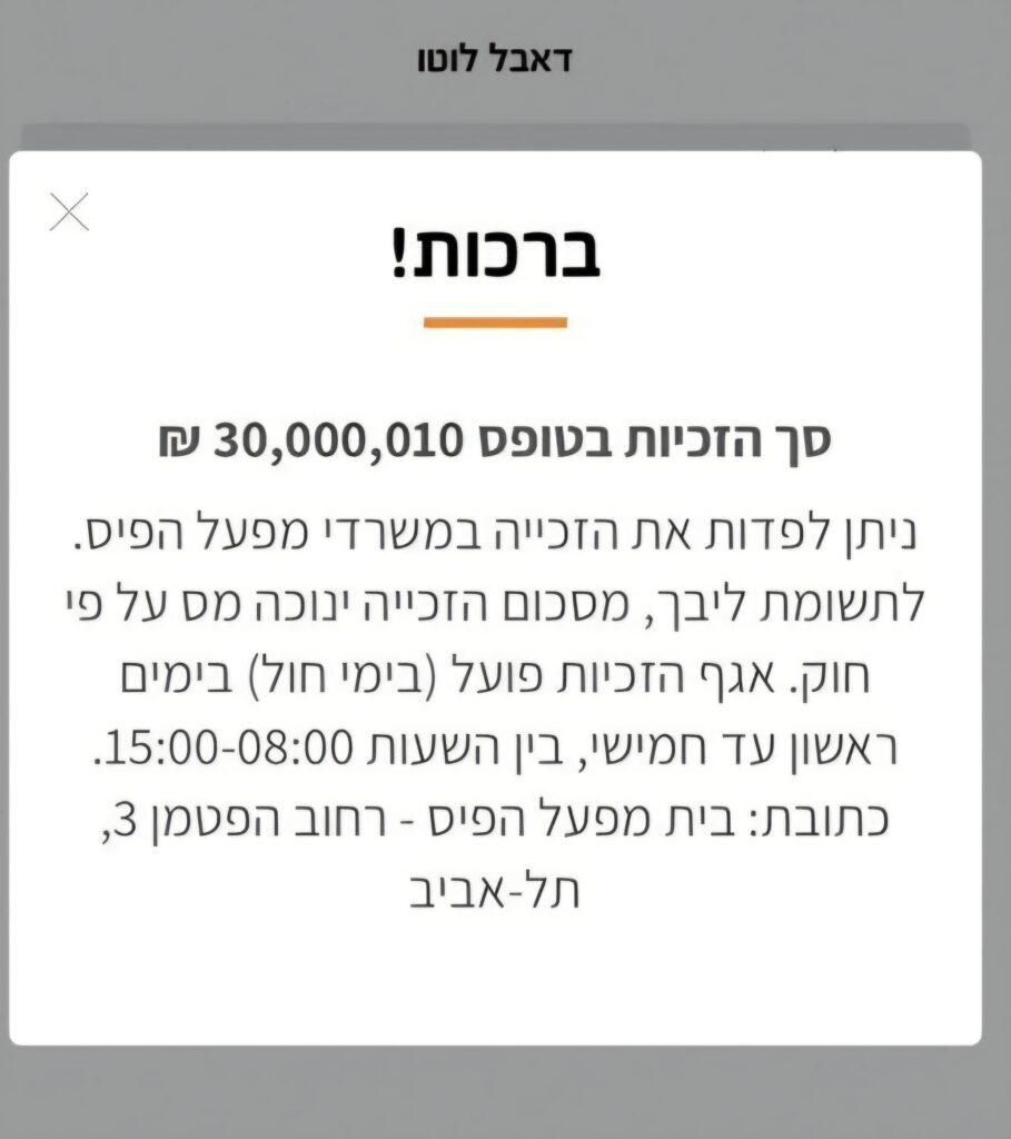 הוא פנה מיד לאשתו שנחה בחדר השינה. "אמרתי לה: 'קורה פה משהו מוזר'. פתחנו יחד את האפליקציה, סרקנו את הטופס, וראינו את הודעת הזכייה".